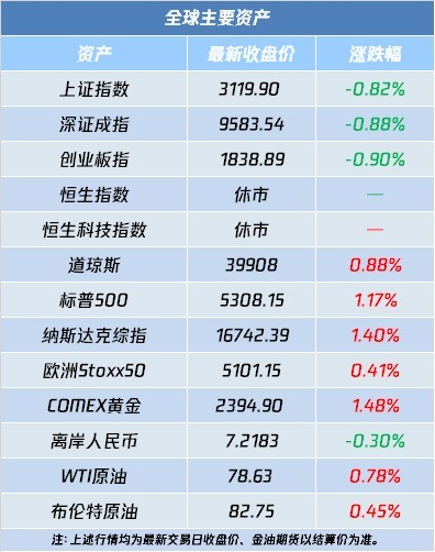 自选哥提示,隔夜美股高开高走,三大指数收盘集体刷新历史新高;人民币资产集体上扬,中概指数微涨0.03%,离岸人民币日内一度大涨超300点;COMEX 6月黄金期货收涨1.48%,报2394.9美元/盎司;WTI 6月原油期货收涨0.78%,报78.63美元/桶。