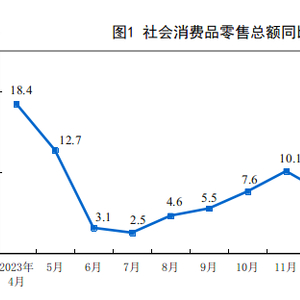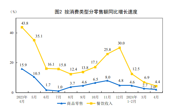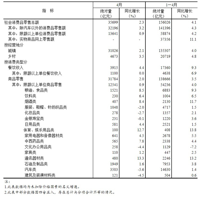据国家统计局数据,4月份,社会消费品零售总额35699亿元,同比增长2.3%。其中,除汽车以外的消费品零售额32196亿元,增长3.2%。1—4月份,社会消费品零售总额156026亿元,同比增长4.1%。其中,除汽车以外的消费品零售额141396亿元,增长4.3%。