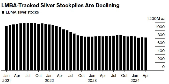 据Silver Bullion的Gregersen称,这导致通常依赖矿商供应的工业用户通过消耗全球主要库存来寻求盎司。伦敦金银市场协会(LBMA)追踪的库存在4月份降至历史第二低水平,而纽约和上海交易所的成交量接近季节性低点。