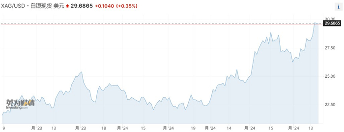 本周,在最新CPI数据显示美国通胀放缓刺激了今年降息的预期后,白银期货创下2013年以来的最高结算价。在周三的Comex交易中,7月交货的白银期货价格上涨了1.03美元,涨幅为3.6%,收于每盎司29.73美元,这是自2013年2月15日以来最活跃合约的最高收盘价。周四,7 月交割的白金价格上涨 0.7%,至每盎司 1077 美元,延续了周三收盘时的涨幅,在周三铂金收涨近3%,创下一年来的最高价位。