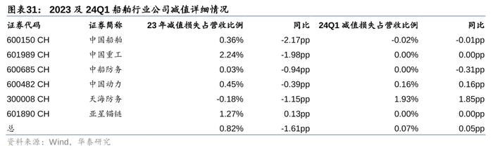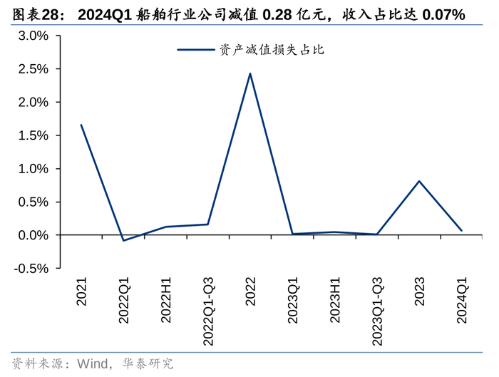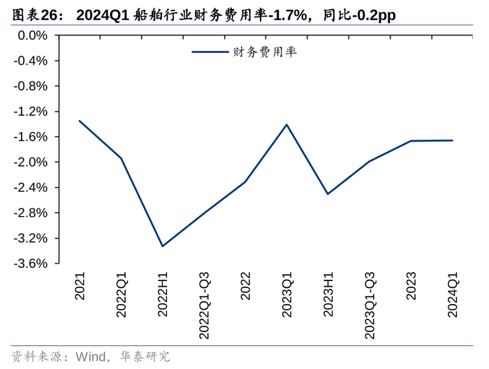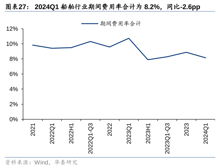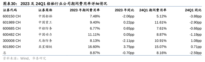 精细化管理持续提升费用管控能力,减值损失收入占比维持低位。2023年船舶行业上市公司期间费用率合计为8.87%,同比-0.70pp。2024Q1船舶行业上市公司期间费用率合计为8.16%,同比-2.59pp。各家公司费用管控能力持续提升。减值方面,2023年船舶行业上市公司减值损失合计15.38亿元,收入占比0.82%,同比-1.61pp;2024Q1,船舶行业上市公司减值损失合计0.28亿元,收入占比0.07%,同比+0.05pp。