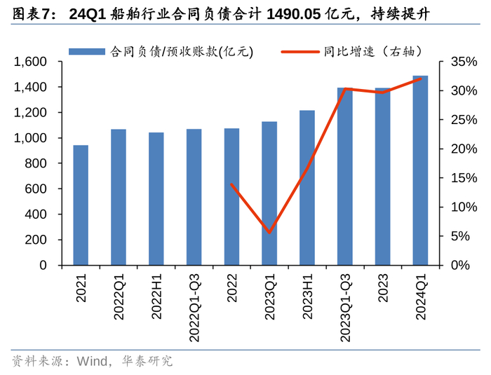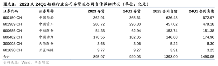 船舶行业生产经营主要由新造船订单驱动,合同负债/存货持续增长有望保障2024年后续收入及业绩增长。2023年全球新接造船订单1.09亿载重吨,同比上升4.8%;截至2023年底,全球手持订单规模达2.68亿载重吨,同比上升7.3%,连续三年增长。目前主要船舶行业上市公司合同负债/存货等显示新签订单及在手订单的指标保持高增,锁定未来收入和业绩的增长。2023年船舶行业上市公司合计存货895.97亿元,同比+14.12%,合同负债(预收账款)合计为1393.00亿元,同比+29.64%。24Q1年船舶行业上市公司合计存货920.03亿元,合同负债(预收账款)合计为1490.05亿元,较2023年底持续增加。各公司存货及合同负债总额持续增加,可间接证明各家公司在手订单持续增长,有望保障公司后续收入、业绩增长。