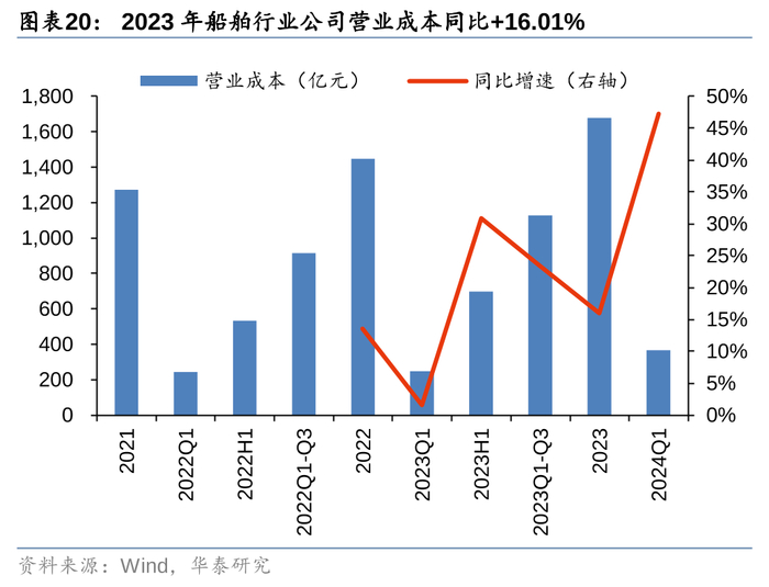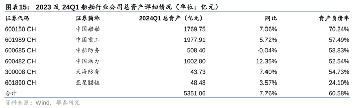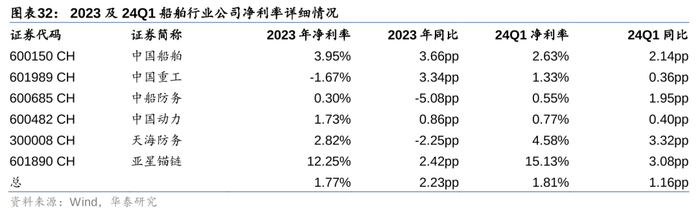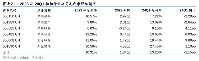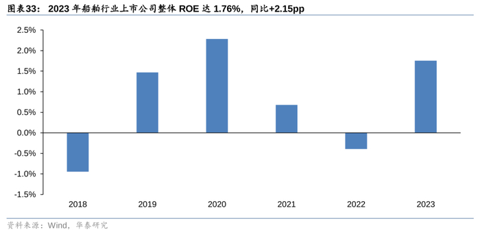 2023年国内船舶行业上市公司整体ROE达1.76%,同比+2.15pp。2023年船舶行业上市公司整体ROE达1.76%,同比+2.15pp。分公司看,亚星锚链、中国船舶、天海防务、中国动力、中船防务、中国重工ROE分别为7.06%、6.27%、5.48%、2.15%、0.30%、-0.94%;从ROE提升幅度来看,中国船舶、亚星锚链、中国重工、中国动力、天海防务、中船防务提升幅度分别为+5.90pp、+2.40pp、+1.68pp、+1.23pp、-2.54pp、-4.12pp。