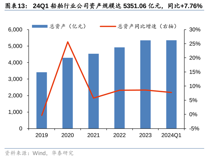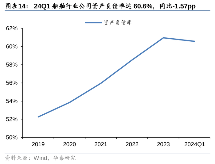 行业资产规模持续提升,资产负债率在合同负债推动下增长至较高水平。2024年第一季度,船舶行业上市公司总体资产规模达5351.06亿元,同比+7.76%;船舶行业上市公司整体资产负债率达60.6%,同比-1.57pp。资产规模提升一方面是因为船舶上行周期下,各公司积极进行资产扩张以满足产能需求;另一方面在于全球造船大型化、高端化、环保化趋势下,对船舶行业在规模、基础设备、材料工艺及环保技术上提出了更高要求,船厂需要进行装备的升级换代和船坞翻新改造。