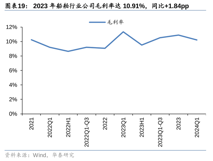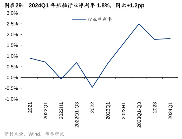 国内船舶行业公司毛利率稳中有升,2023年毛利率同比+1.84pp。2023年,船舶行业上市公司整体毛利率达10.91%,同比+1.84pp,2024Q1船舶行业上市公司毛利率为10.20%,同比-1.15pp。船舶行业毛利率主要受新造船订单价格及原材料成本影响,2022年以来船用钢板原材料价格保持稳定的同时,克拉克森新造船价指数持续上行,因此行业毛利率稳步提升。随着船厂在手高价船订单后续进一步交付,毛利率有望进一步提升。