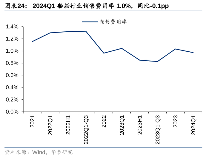 2023年船舶行业上市公司净利率1.77%,同比+2.23pp;2024Q1船舶行业上市公司净利率1.81%,同比+1.16pp。受益于行业费用管控能力持续提升及减值损失占比降低,2023及24Q1船舶行业上市公司净利率变化幅度相对毛利率呈现较好趋势。2023年船舶行业上市公司净利率1.77%,同比+2.23pp;2024Q1船舶行业上市公司净利率1.81%,同比+1.16pp。