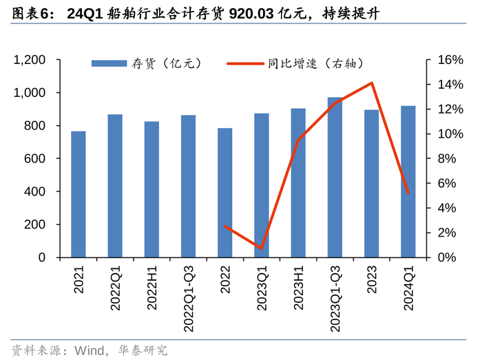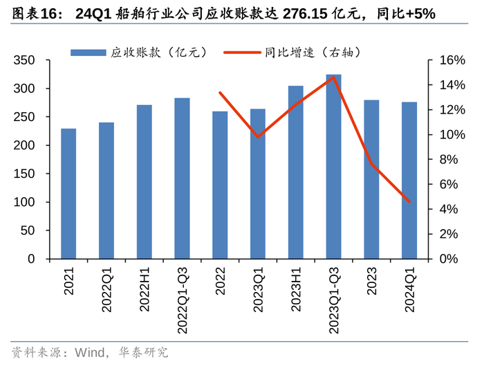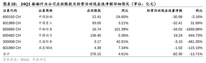 23年/24Q1,船舶行业上市公司应收账款分别为279.80/276.15亿元,同比+7.64%/+4.61%;经营性现金流净额分别为309.97/-82.30亿元,同比+1451.09%/-13.71%。船舶行业上市公司应收账款持续增长,间接表示行业高景气度下造船业务扩张趋势。2023年经营活动现金流量净额同比高增主要系船舶行业公司开始收回2022年行业复苏初期签订的订单的发货款、验收款及尾款,因此现金流表现较好。