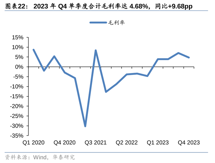 韩国船企毛利率逐季修复,2023年全年合计毛利率4.88%,同比+10.01pp;其中Q4单季度合计毛利率达4.68%,同比+9.68pp。2023年全年韩华海洋/三星重工/HD韩国造船海洋毛利分别为988.12亿/6454.79亿/1.05万亿韩元,同比分别增长1.45/1.11/0.68万亿韩元;对应毛利率分别为1.33%/8.06%/4.92%,同比+29.05/+15.83/+2.80pp。