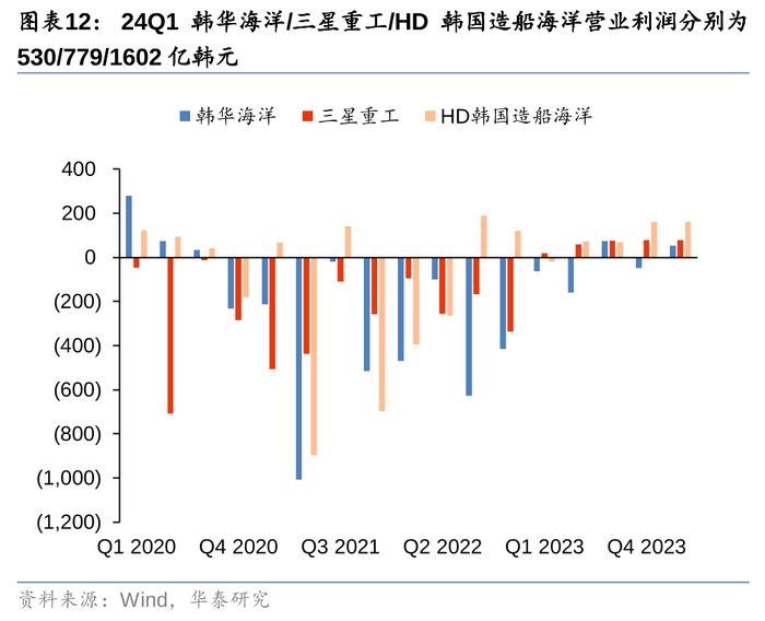2023Q3以来韩国船厂合计营业利润同比大幅扭亏。23年/24Q1合计营业利润为3188/2911亿韩元,同比分别增长3.14万亿/3536亿韩元。其中韩华海洋/三星重工/HD韩国造船海洋23年营业利润分别为-1967/2333/2823亿韩元,同比增长1.42/1.09/0.63万亿韩元;24Q1营业利润分别为530/779/1602亿韩元,同比增长1160/583/1792亿韩元。