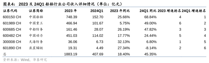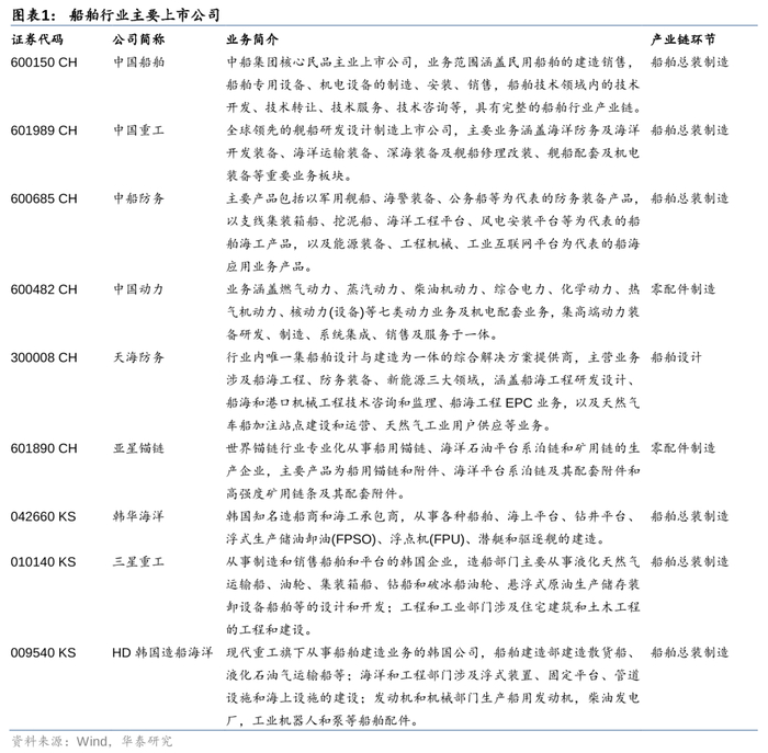 我们的统计样本包括了船舶行业9家上市公司,覆盖船舶设计、零配件制造、船舶总装制造全产业链。根据船舶制造过程中各个阶段的主要内容,可大致分为船舶设计、零配件制造、船舶总装制造三个环节。为详细探讨船舶行业23年报及24年一季报业绩表现全貌,我们首先挑选了船舶行业6家国内上市企业:中国船舶、中国重工、中船防务、中国动力、天海防务、亚星锚链的财务数据进行分析总结;随后补充3家韩国上市企业韩华海洋、三星重工、现代重工子公司HD韩国造船海洋的相关信息以把握国内外造船业的共同趋势。