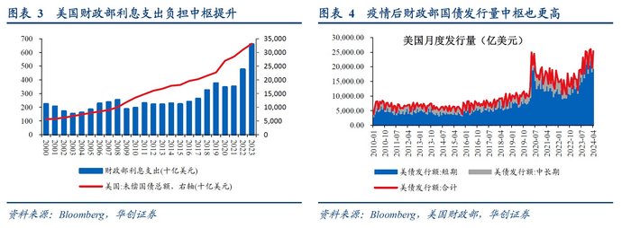 疫情后美国国债发行快速膨胀,未偿国债余额由2019年的22.7万亿美元扩张至2023年末的33.2万亿美元,这同时带来利息支出负担与债务滚续压力的提升。2023年财政部净利息支出达到6593亿美元,较2019年的3752亿美元增长约2800亿美元;同时2023年下半年以来,美债单月发行金额中枢在2.2万亿美元左右,较2019年1万亿美元的中枢增长近1倍。