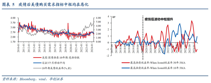 财政部保有更高的TGA余额有助于保障财政利息支出的“安全垫”、或在国债发行较差时保障债务滚续安全。疫情后财政TGA余额中枢较疫情前提升4000亿美元以上,可在一定程度对冲2800亿美元年利息支出的增长与1万亿美元国债月发行量的提升。由于疫情后美债发行量大增,而衡量美债购买需求的指标均反映疫情后美债需求持续出现弱化,而财政部保有更高的TGA余额,可以平滑季度之间的国债发行量,保障国债购买需求较弱时债务滚续的安全。