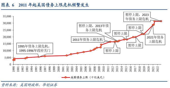 另外,美国债务上限问题愈发成为两党的政治工具。债务上限为美国国会设置的联邦政府发债规模的上限,发债规模触及上限后财政部将无法进一步扩张其债务规模,但同时财政部仍需维持必要的支出与国债的滚续,因此如果财政手里存款越多,面临债务违约的时点则可更延后。尽管历史上来看,上调债务上限最终会得到两党的共识,债务上限问题也并未实质上起到限制美国债务扩张的作用,但在两党制下非执政党可以通过约束债务上限的方式制约执政党的财政支出,债务上限成了两党政治斗争的工具,2011年起美国债务上限危机频繁发生。