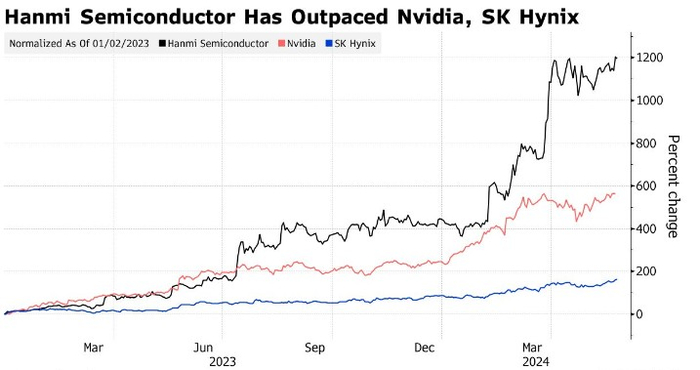 仅今年一年,该股就上涨了一倍多,成为MSCI亚太指数中表现最好的股票,这主要得益于人们对该公司热压键合的炒作。该公司向SK海力士供应这些设备,用于为英伟达(NVDA.US)等公司制造高带宽内存。韩美半导体最近还赢得了美光科技(MU.US)的订单。