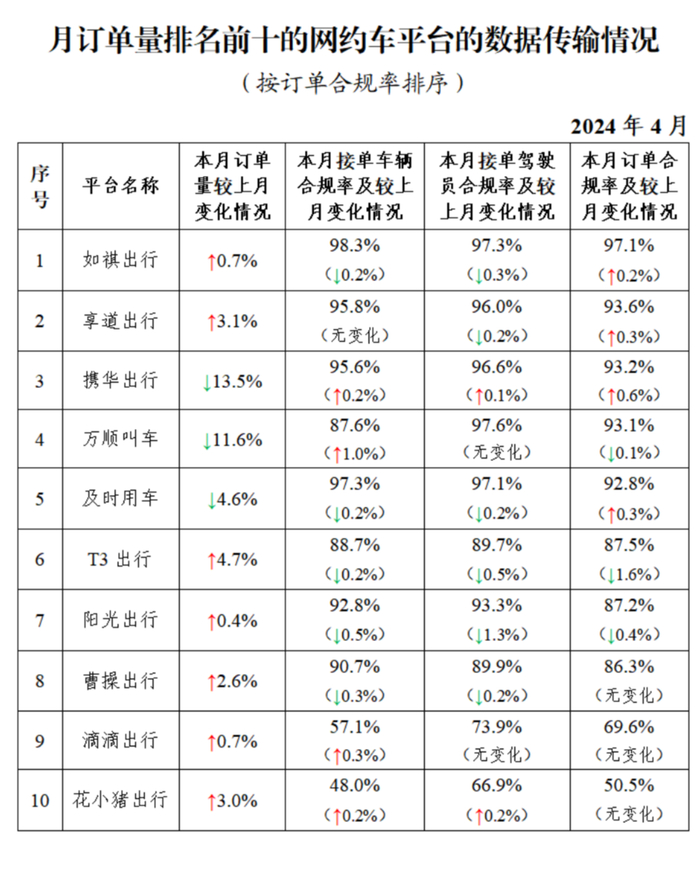 其中,面向乘客、与网约车平台公司共同提供服务的平台(俗称“聚合平台”)完成2.32亿单,环比下降3.6%。按订单合规率由高到低的分别是滴滴出行、高德打车、花小猪出行、携程用车、百度打车、腾讯出行、美团打车。