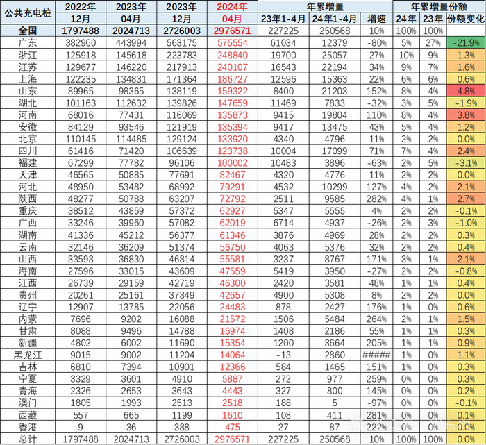 2024年1-4月山东与河南的充电桩均增长2万个左右,份额增长较快。