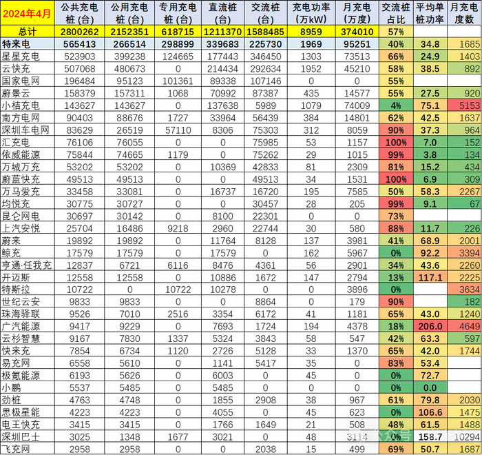 运营商的头部效应明显。目前的直流充电桩的发展规模较大,头部的运营商表现较强。广汽能源的充电桩4月平均充电达到4649度,表现很好。蔚来的充电桩充电量达到2000度左右,特斯拉达到3634度,而部分老旧充电桩的充电平均仅有月均100多度,主力充电企业的月均充电在千度水平,充电电量差距几倍到几十倍的效益差距极其巨大。特斯拉这月没数据,拉低了总体水平。