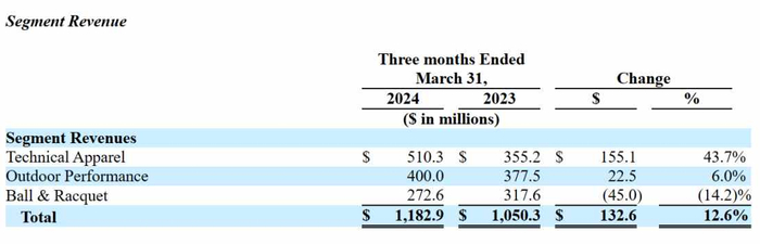拆分其业务数据可以发现,虽然萨洛蒙鞋服业务当期在大中华区和亚太地区实现双位数增长,但市场火爆背后,亚玛芬的户外性能服饰业务营收也仅增长了6%至4亿美元;另外一个球类及球拍装备业务的营收甚至只有2.73亿美元,同比下降了14.2%。