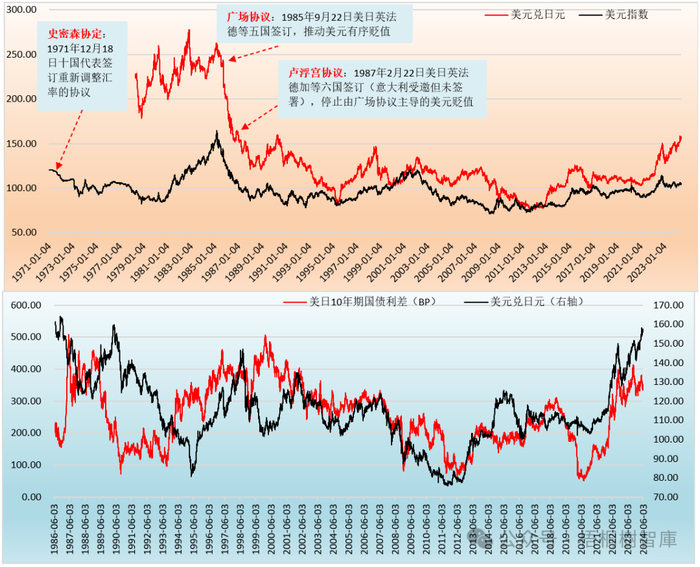 (一)2021年以来,日元持续大幅贬值,由美元兑日元由102附近快速升至目前的160附近,重回1990年的水平。其中,有两个时间段贬值速度最快,分别为2021年1月至2022年11月以及2023年以来,第一个时间段美元兑日元由102附近升至150附近,第二个时间段美元兑日元由125附近升至160附近。
