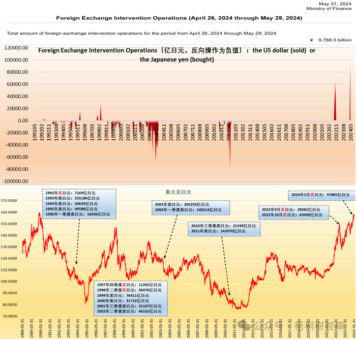2024年5月31日,日本财务省发布数据显示,其在2024年4月26日至5月29日期间,动用了97885亿日元(合计约622亿美元)来干预汇率,创下历年单月最大干预规模。