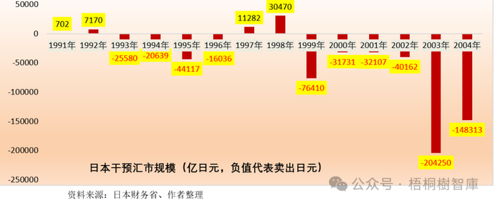 4、1999年1月至2004年3月期间,日本合计卖出532973亿日元,以阻挡日元升值。其中,1999-2004年日本分别卖出76410亿日元、31731亿日元、32107亿日元、40162亿日元、204250亿日元和148313亿日元。