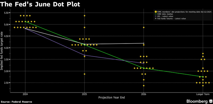 作为美联储利率决议之后所发布的声明文件中最为瞩目的一部分,利率点阵图中值目前显示,多数美联储官员预计2024年将仅降息一次,相比3月点阵图的预测整整少了两次,总计减少50个基点幅度。并且这一次点阵图出现了多达四位美联储官员支持年内不降息,三月点阵图中支持年内降息三次的10个点这次则悉数消失。