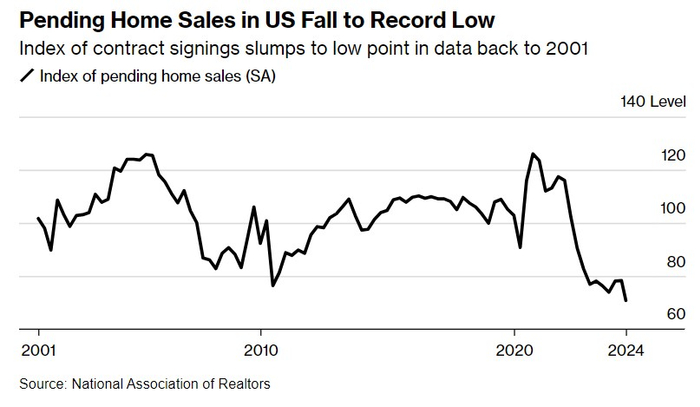 周四公布的另一份报告显示,在美联储长期维持高利率的重压之下,猛增至7%左右的抵押贷款利率对房地产市场的负面影响愈发猛烈。全美房地产经纪人协会(NAR)公布的二手房签约指数创下新的纪录,5月份的二手房签约数量意外跌至2001年以来的最低水平。