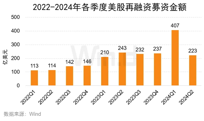 2024年上半年美股市场再融资募集金额共629亿美元,较去年同期上升38.86%;再融资事件为446起,较去年的410起增加8.78%。二季度募集资金223亿美元,同比下降8.26%;再融资事件202起,同比减少5.16%。