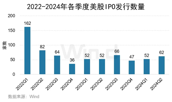 2024年上半年美股IPO数量累计114家,同比增加9.62%;IPO募集金额累计194亿美元,同比上升63.30%。二季度IPO发行数量为62家,较去年同期增加10家;IPO募集金额97亿美元,同比上升15.20%。