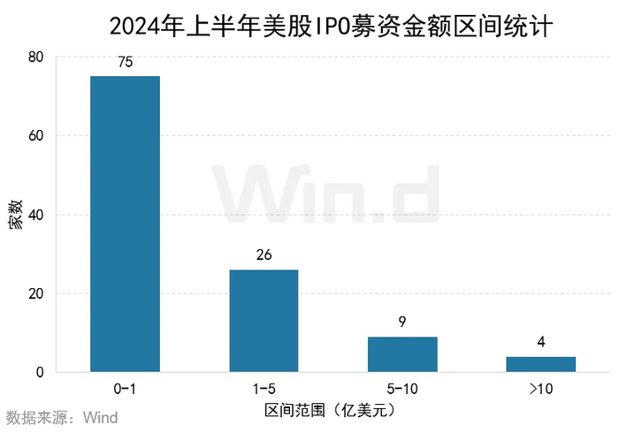 2024年上半年美股IPO融资金额在1亿美元及以下的数量共计75家,占到IPO总数的66%;融资规模在1-5亿美元区间的数量为26家,在5-10亿美元区间的为9家,10亿美元以上的为4家。