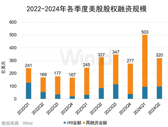 2024年上半年美股一级市场股权融资总金额为823亿美元,较去年同期融资金额572亿美元增加43.93%,融资环境持续改善。其中,IPO融资规模为194亿美元,同比上升63.30%;再融资规模629亿美元,同比上升38.86%。