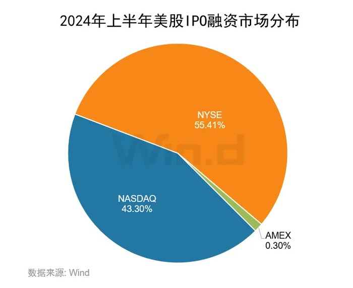 从IPO市场分布来看,2024年上半年美股IPO家数最多的依旧来自纳斯达克,共74家企业上市,募资规模总计为83.89亿美元,占美股市场总规模的43.30%;纽交所实现30家IPO,募资额为107.36亿美元,占美股市场总规模的55.41%;AMEX交易所实现10家IPO,募资额为2.50亿美元。