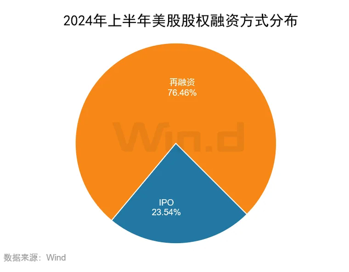 从具体融资方式来看,2024年上半年IPO募资金额为193.75亿美元,占总募集金额的23.54%;再融资金额629.36亿美元,占比76.46%。