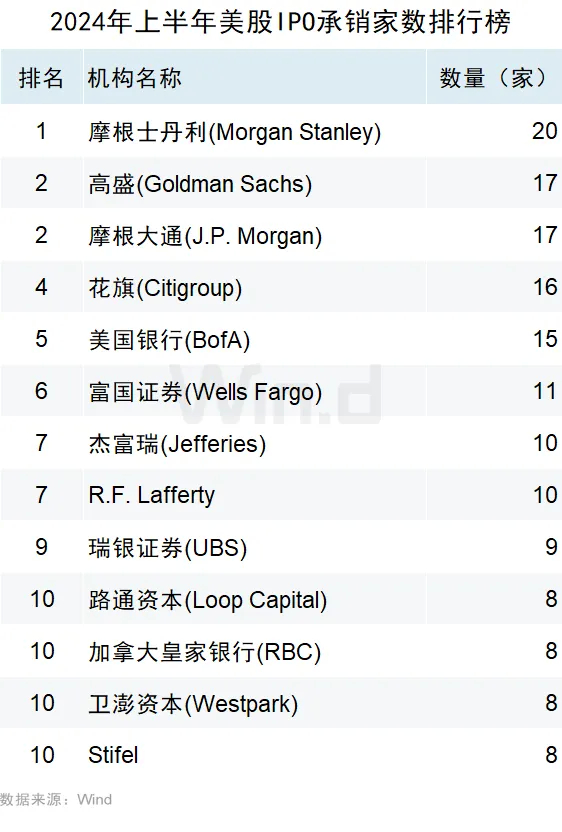 从IPO承销数量来看,摩根士丹利以参与20家IPO承销项目位居榜首,高盛和摩根大通均以17家承销家数并列第二。