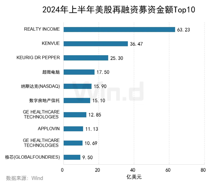 2024年上半年再融资金额最高的公司是Realty Income,为63.23亿美元;Kenvue和Keurig Dr.Pepper分别以36.47亿美元和25.30亿美元位列第二和第三。