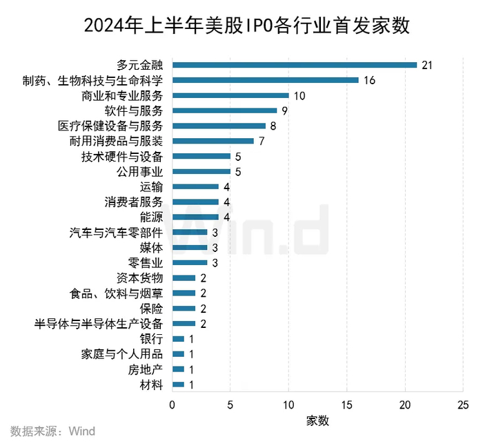 从各行业IPO发行数量来看,位居榜首的是多元金融行业,共计21家IPO项目,制药、生物科技与生命科学行业以16家位列第二,商业和专业服务行业以10家位列第三。
