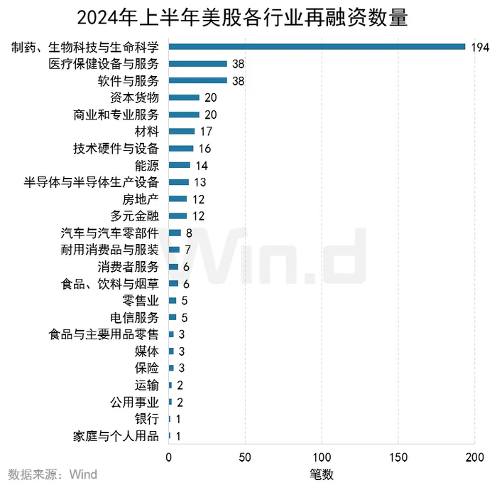 从再融资数量来看,制药、生物科技与生命科学行业的再融资数量为194起,排名第一;医疗保健设备与服务和软件与服务行业均以38起募资数量并列第二。