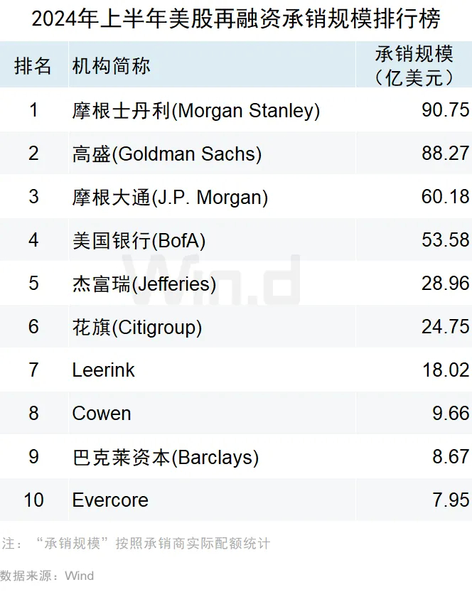 再融资承销规模方面,摩根士丹利以90.75亿美元承销规模位列第一,承销数量为42起;高盛承销规模为88.27亿美元,参与了47起再融资事件,位列第二;摩根大通以60.18亿美元承销金额,参与49起再融资位居第三。