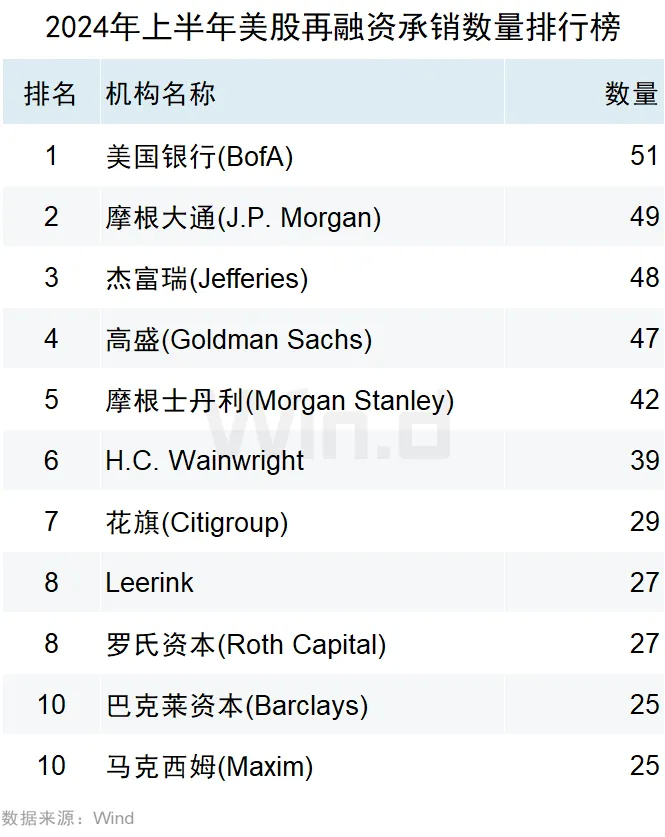 美国银行上半年参与了51起再融资事件,位列第一名;摩根大通以49起再融资承销排名第二;杰富瑞以48起再融资承销位居第三。