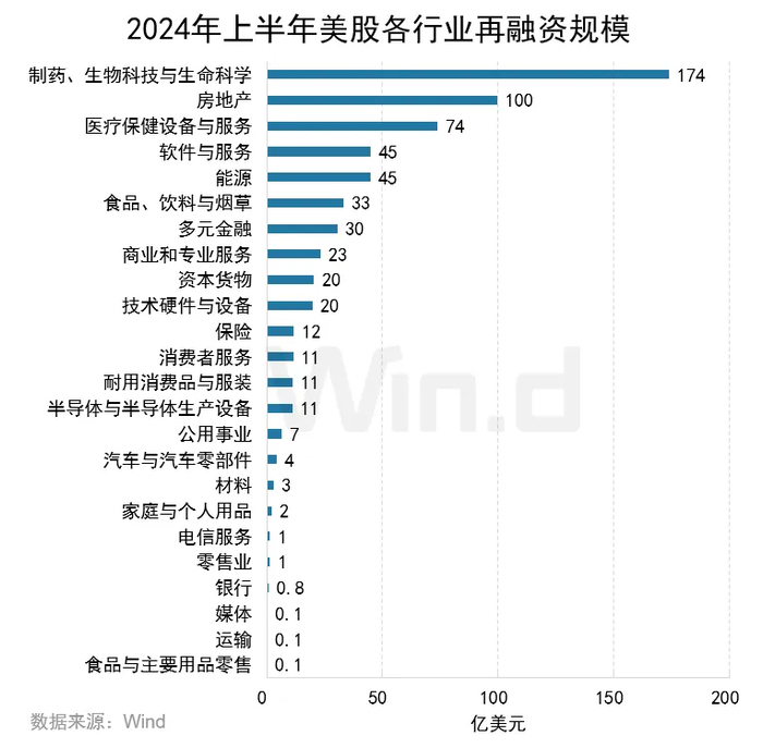 2024年上半年再融资募集金额最高的行业为制药、生物科技与生命科学,再融资规模为174亿美元;房地产行业以100亿美元的募集金额排名第二;医疗保健设备与服务以74亿美元募集金额位列第三。