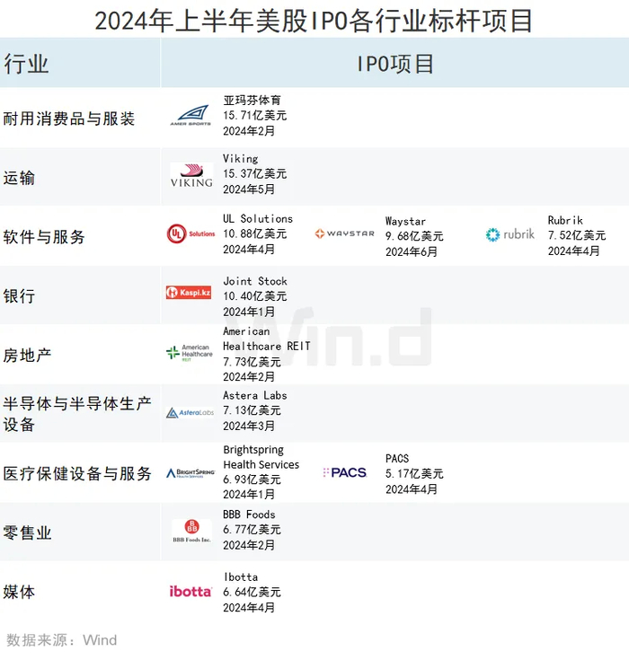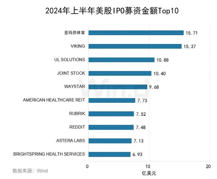 IPO融资金额最高的公司是亚玛芬体育,为15.71亿美元。Viking和UL Solutions分别以15.37亿美元和10.88亿美元位列第二和第三名。前十大IPO项目共募集98.83亿美元,占全部IPO募资总额的51.01%。