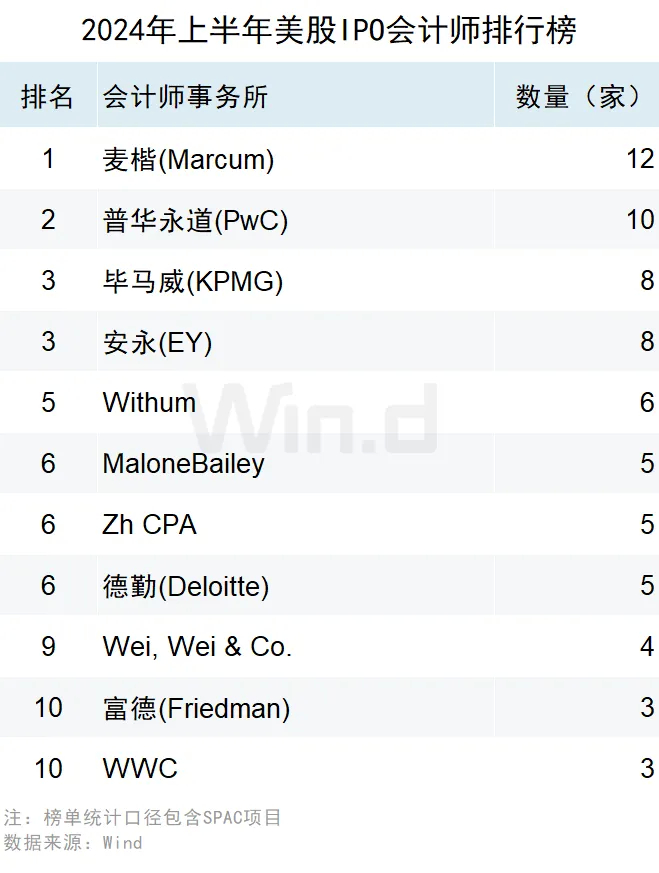 麦楷(Marcum)以参与12家上市公司IPO位列会计师排行榜中的首位;位居第二的是普华永道(PwC),参与了10家IPO;毕马威(KPMG)和安永(EY)位居第三,均参与了8家IPO。