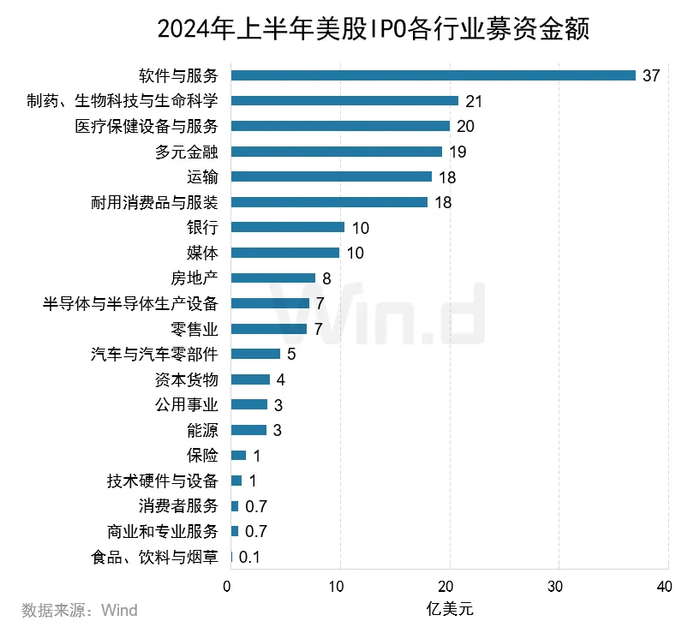 从上市主体行业分布来看,IPO募资规模最高的行业为软件与服务,募集金额达37亿美元;其次为制药、生物科技与生命科学行业,募集金额21亿美元;第三名为医疗保健设备与服务行业,募集金额20亿美元。