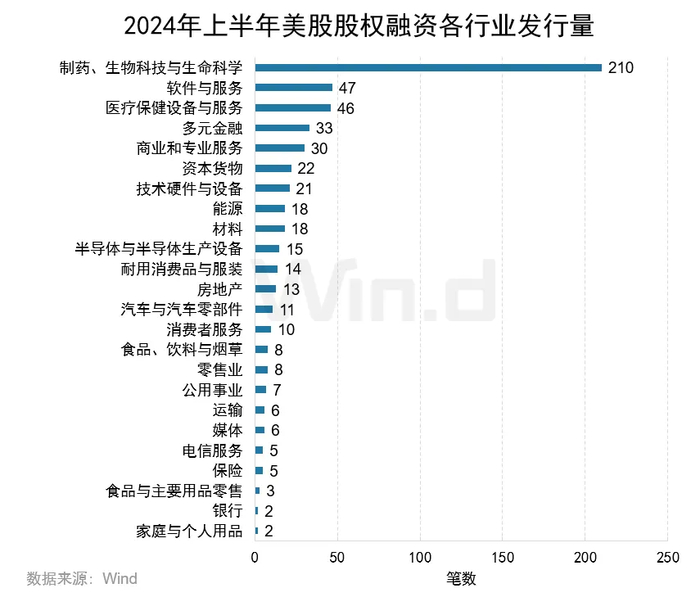 从各行业融资事件数量来看,制药、生物科技与生命科学行业以210起融资数量位居榜首;软件与服务行业以47起融资数量位居第二;医疗保健设备与服务行业以46起融资数量位列第三名。