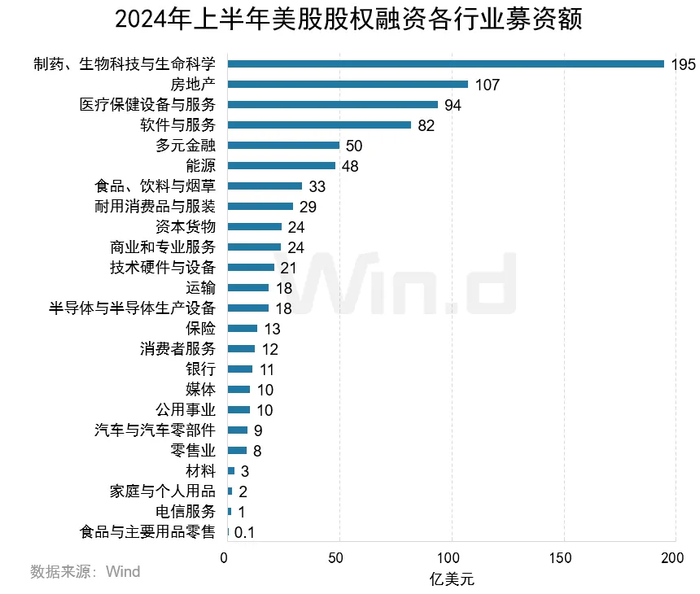 从各个行业的融资情况分布来看,制药、生物科技与生命科学行业居第一位,融资金额为195亿美元;房地产行业排名第二,融资金额为107亿美元;医疗保健设备与服务行业以94亿美元的融资规模排名第三。