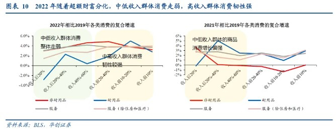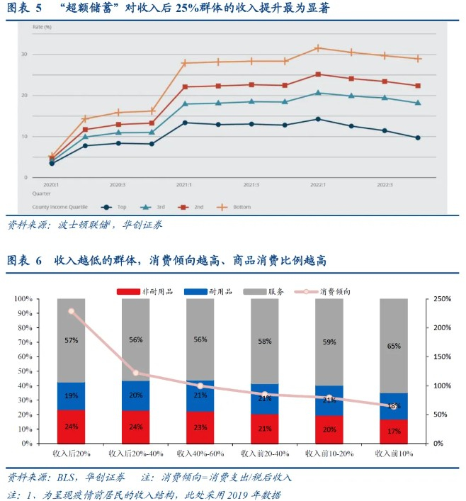 低收入群体具有高消费倾向、且消费结构以商品为主的特点。根据BLS发布的分收入水平居民消费支出数据,在疫情带来超额储蓄与财富前,收入水平越低的群体,边际消费倾向(消费倾向=消费支出/税后收入)越高:收入后20%群体消费倾向可达229%,而前10%群体消费倾向仅64%;并且从消费结构来看,后20%群体的商品消费占比43%,且收入水平越低、商品消费占比越高。因此,当2021年超额储蓄大幅提升时,中低收入群体在获得额外的收入后,高消费倾向催生了一轮消费热潮,且以非耐用品和耐用品消费为主。但随着2022年-2023年超额储蓄逐步下降,中低收入群体消费开始走弱,反映在宏观数据上即为商品消费增长的放缓。