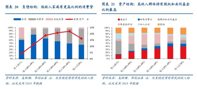 低收入群体——占总人口比重的13%,但收入仅占社会总收入的2%,收入主要依赖政府补贴;负债压力较大,且债务结构以消费贷为主;拥有的净资产(财富)仅占社会总财富的3%,其中房地产资产占比近50%。