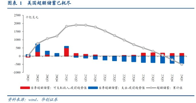 美国经济韧性的关键词,从“超额储蓄”切换到“超额财富”。2021年以来,“超额储蓄”一直作为居民消费的重要流动资金来源,支撑美国消费支出持续偏强。但2023Q4以来超额储蓄已耗尽,支持消费韧性的关键防线,可能逐步切换到由资产价格增值所带来的“超额财富”。