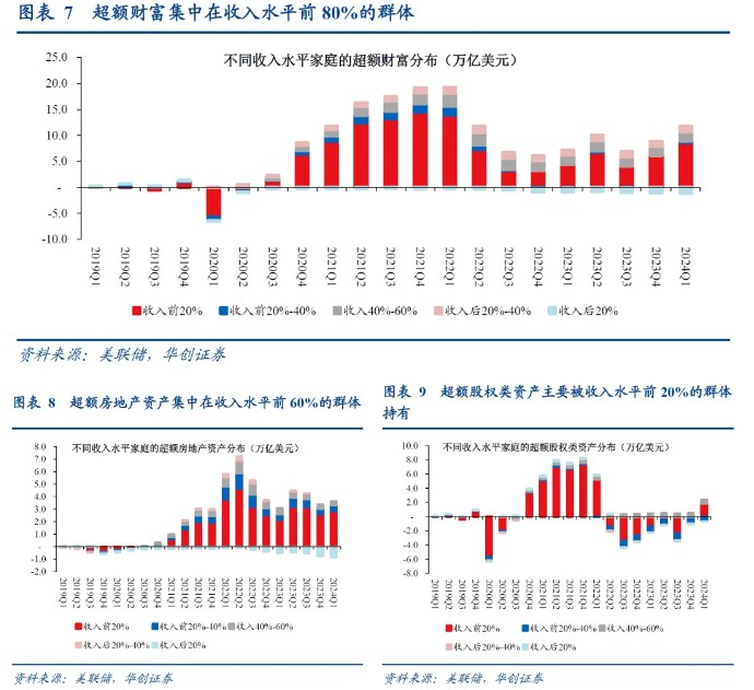 “超额财富”不同于“超额储蓄”,主要来自于持有股、房等资产比例更高的中高收入群体,且分配极不均衡。疫情以来,由于不同收入群体的资产结构分配不均衡(见图表21),“超额财富”分配也高度不均衡,超额财富集中在收入水平前1%-80%的家庭手中;收入水平越低的家庭,获得的“超额财富”越少,收入后20%群体的“超额财富”已转为负值——截至2024Q1超额财富总计约11万亿美元,其中收入水平前80%的家庭持有约12万亿美元,而收入后20%家庭的超额财富为-1.2万亿美元。