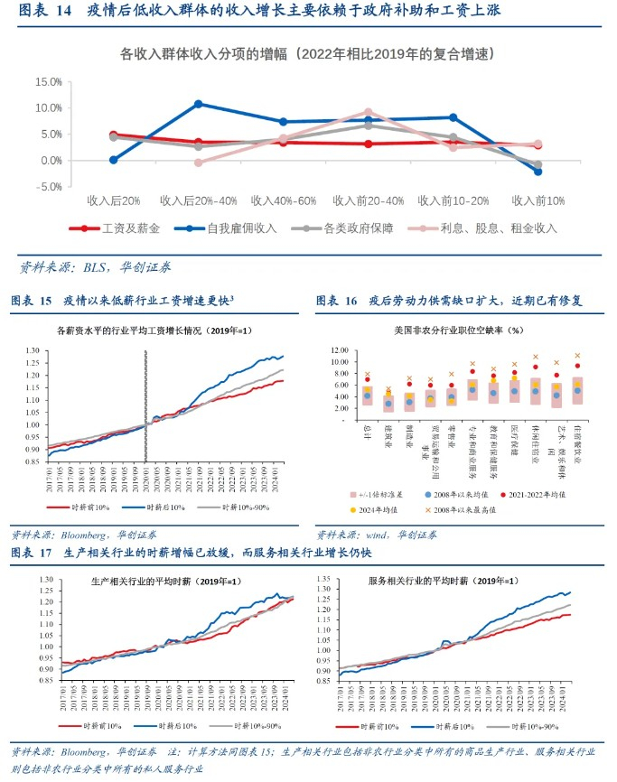 但服务和商品消费需求分化,带来生产相关行业低薪劳动力的工资增长已放缓。随着财富分配不均带来服务和商品消费需求分化,制造业、批发零售业的劳动力供需缺口回落至历史平均水平;相应的,生产相关行业的低薪从业人员“超额工资”红利基本消失,时薪增长基本回到疫情前的趋势值。而服务业在消费需求韧性下则保持了更高的劳动力供需缺口和工资增长韧性。而生产相关行业低薪劳动力的工资增长回归“常态”,推高了这部分群体的信用卡逾期率。这也是为什么美国经济总量数据还很强的情况下,却出现了贷款逾期率提升背后潜在的结构性问题。